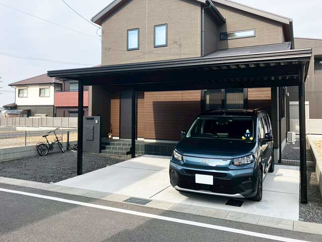 一般的にカーポートを後付けする場合、柱位置の調整などで既存の土間コンクリートを一部撤去・補修するケースもありますが、今回は自由設計ならではの対応により、既存の土間をそのまま活かした施工となりました。
