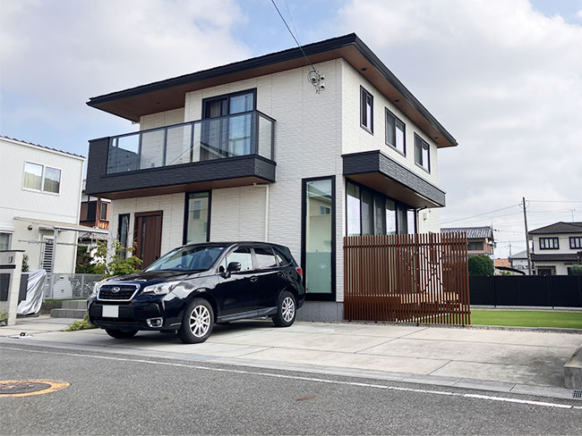 建物のブラック×ホワイトの外観に馴染む端正なデザインで、駐車スペースの使い勝手と見た目の両方をしっかり底上げします。