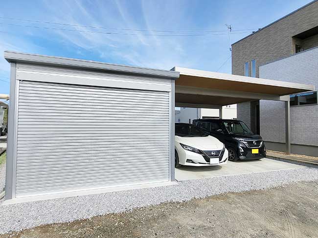 敷地には、2台分のカーポートとシャッター付きガレージを設置しました。