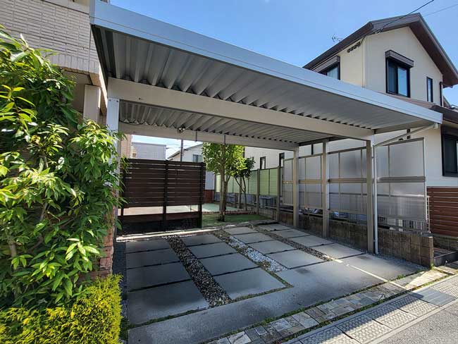 もともと整えられていた平板のデザインと新しいカーポートが違和感なくなじみ、部分的なリフォームでありながら、外構全体の印象がすっきりと整いました。