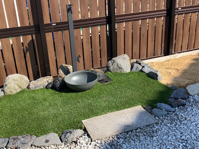 お庭の水まわりの足元には、雑草対策と景観性を兼ねて人工芝を施工しました。