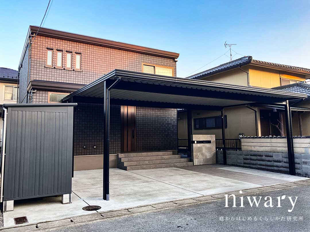 重厚感のある折板屋根のカーポートを中心に、シンプルながらも機能性をしっかり確保した外構プランです。