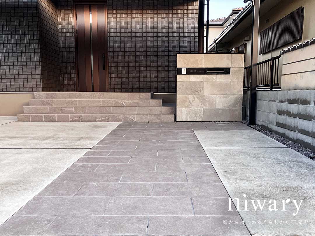 アプローチと素材感を揃えることで、外構全体に統一感を持たせています。