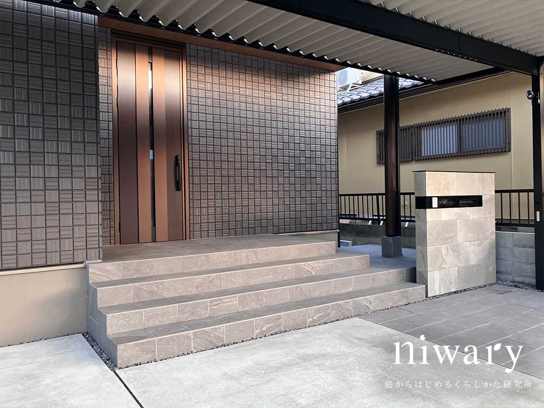 アプローチには大判のタイルを採用し、落ち着いた色合いで全体に統一感を持たせました。