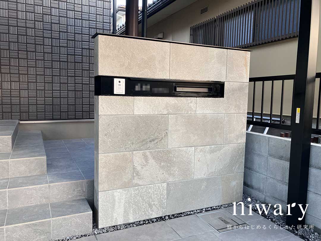 門まわりには、タイル貼りの門柱を設置。