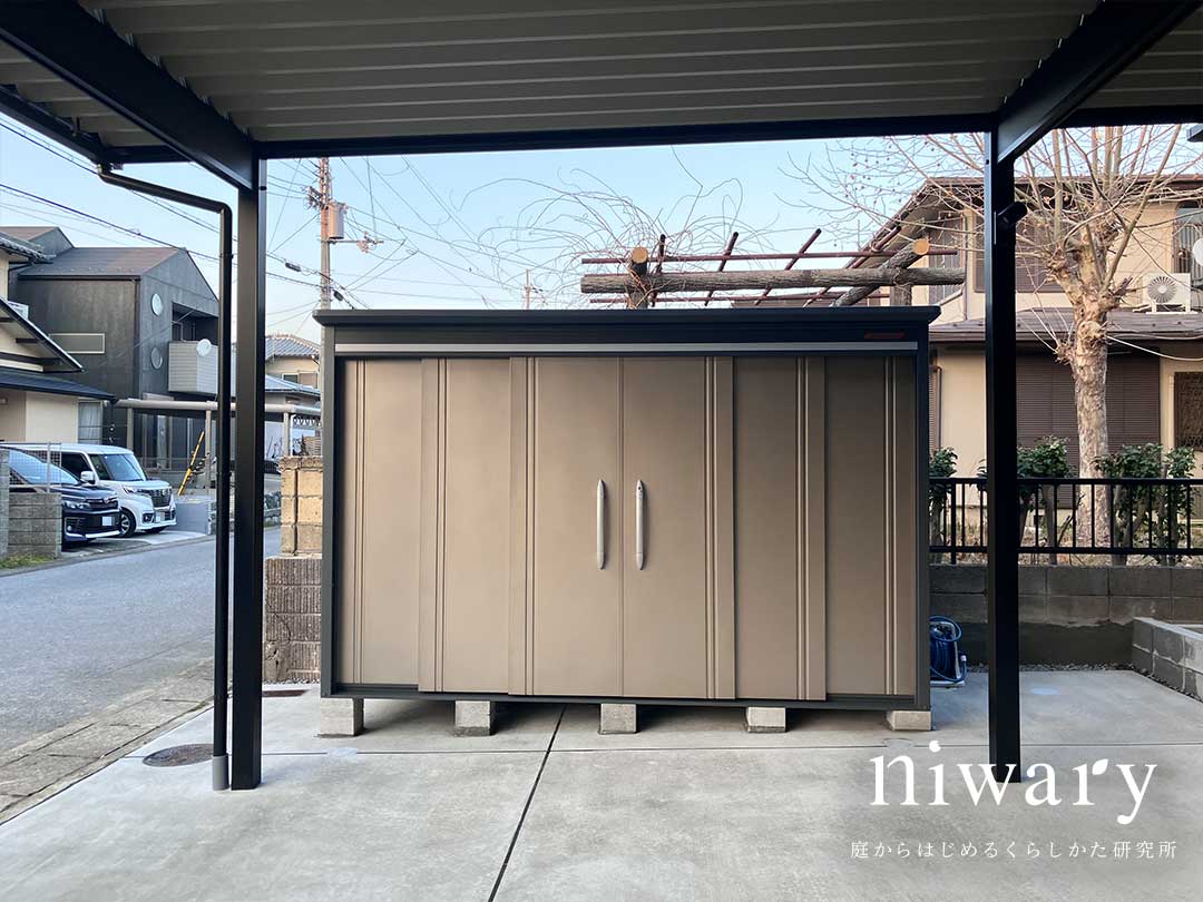 また、カーポート横には物置を配置し、生活感の出やすいものをしっかり収納できるようにしています。
