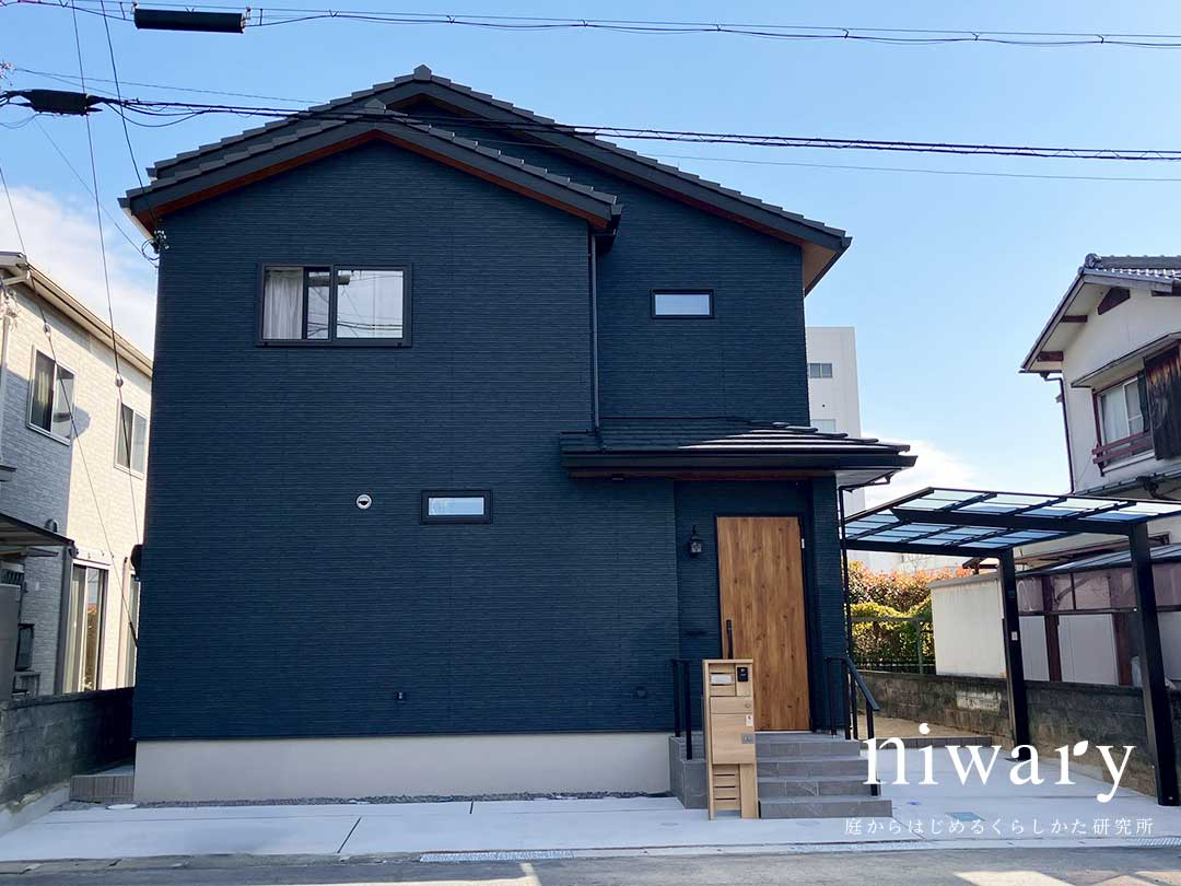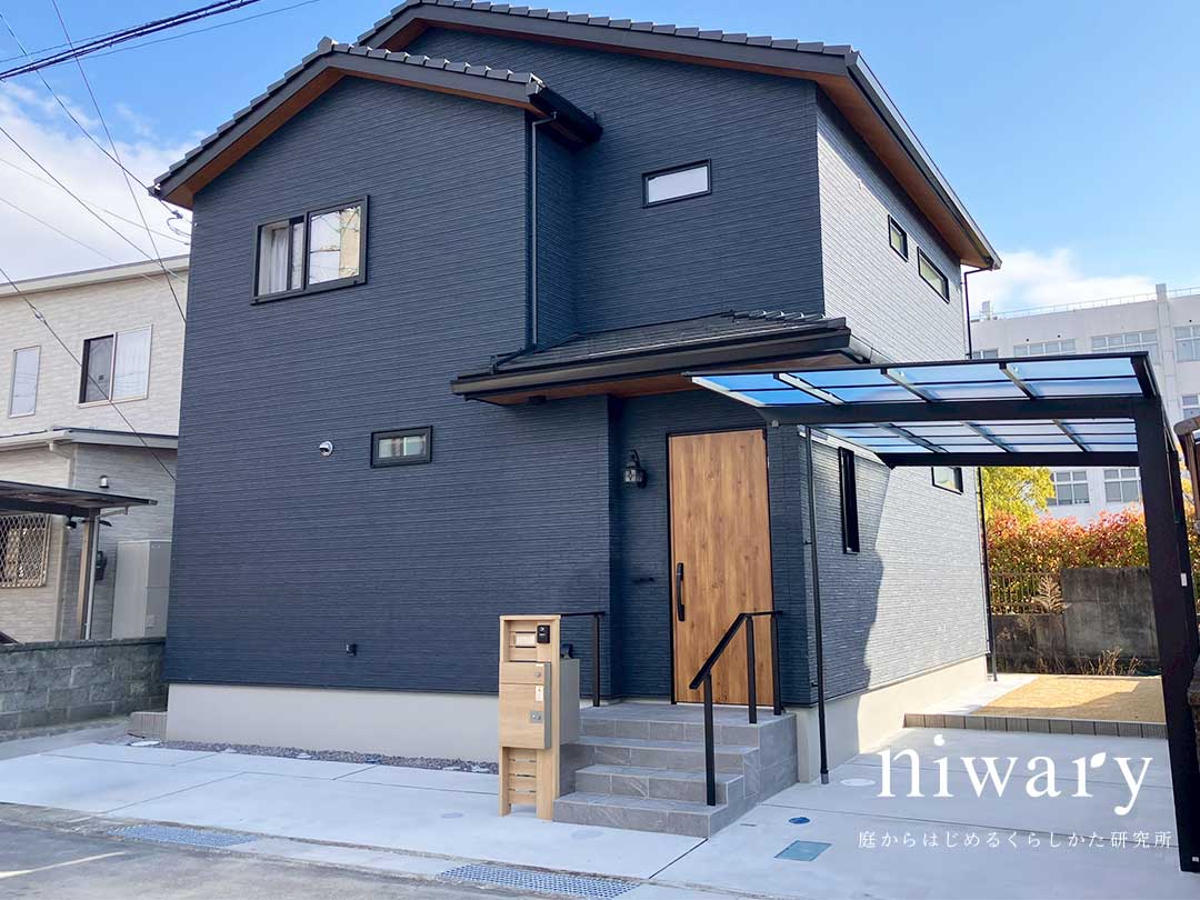 建物のシックな外壁に合わせ、外構はブラック系をベースに統一。