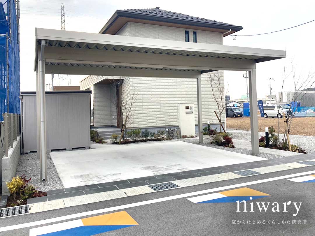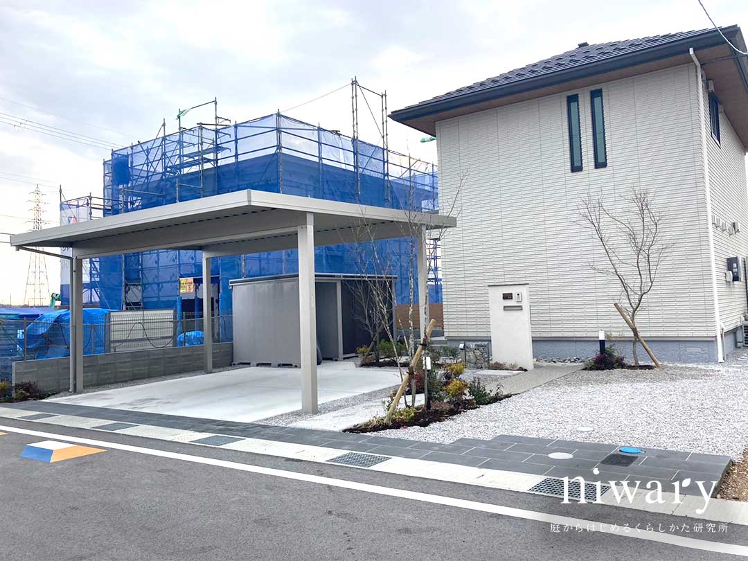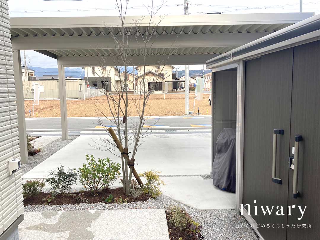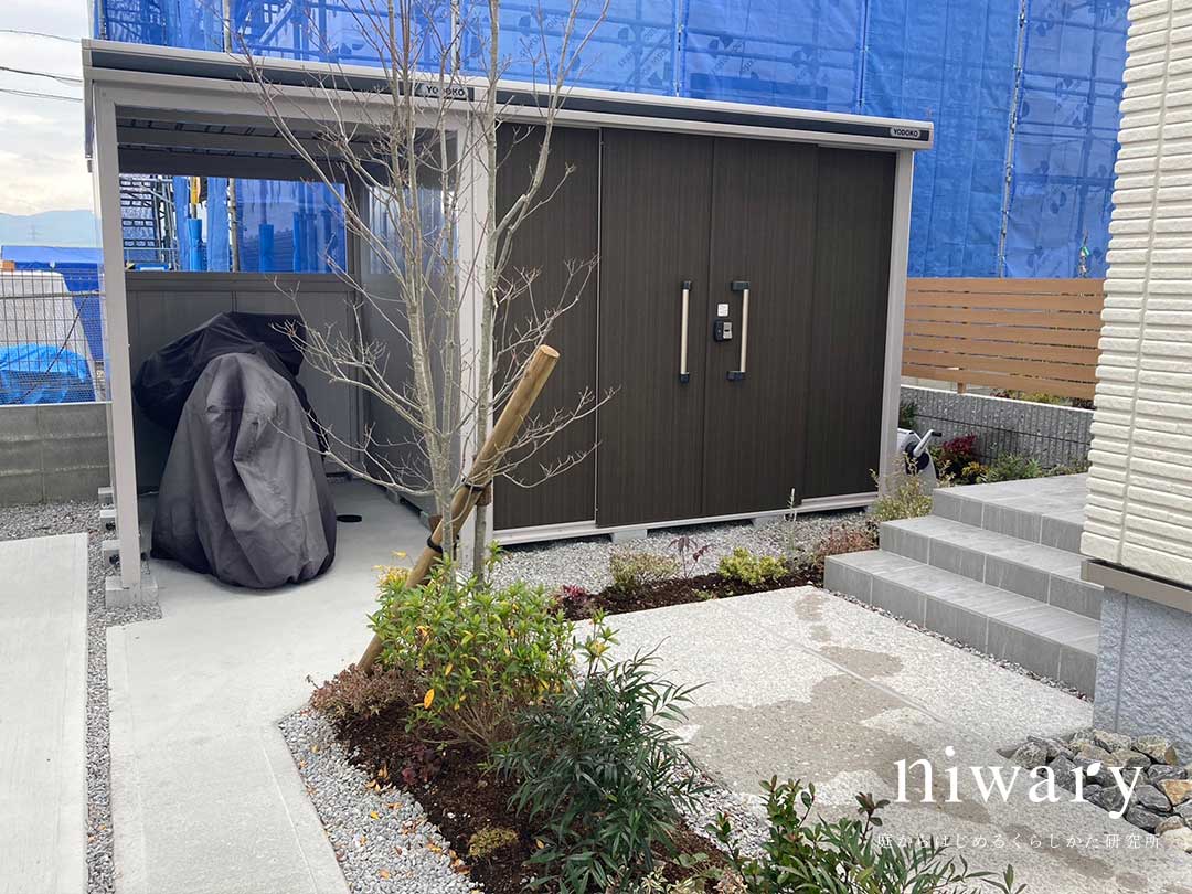 樹木や低木などの植栽が先に終わっていたため、カーポートや物置の設置にあたり、配置に問題が生じましたが、お客様のご協力、ご承諾を得ながら内容を変更し、完工することができました。