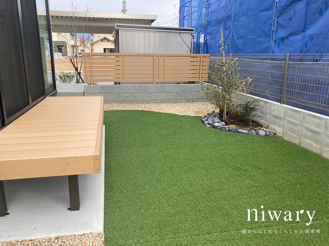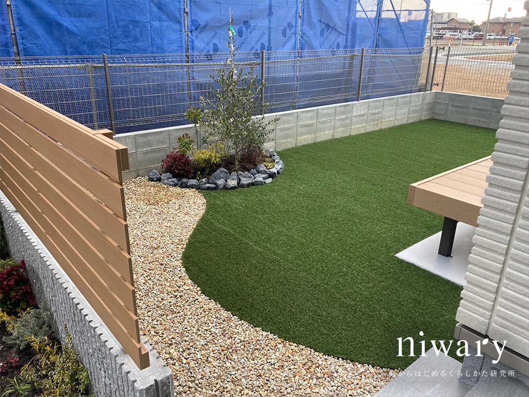ハウスメーカーさんで全体的に外構が終わっていたところに、カーポート、サイクルスペース付き物置、庭の人工芝と防草シート+錆砂利敷きの工事をご依頼いただきました。