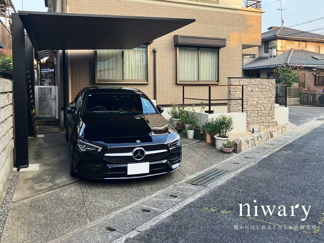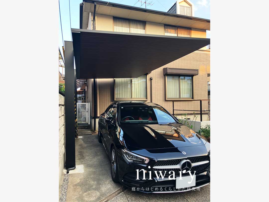 新しく設置されたカーポートは、シンプルでスタイリッシュなデザイン。