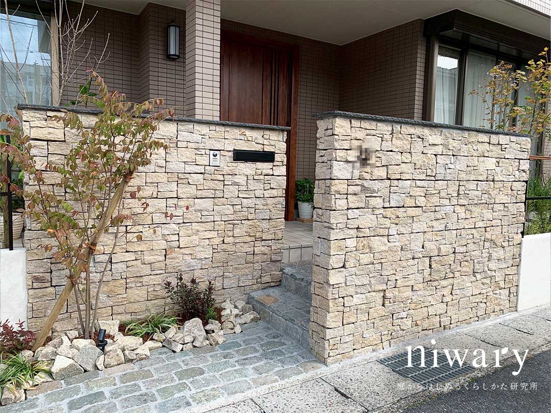リフォーム後の門柱は、自然石を積み上げたような表情豊かなデザイン。