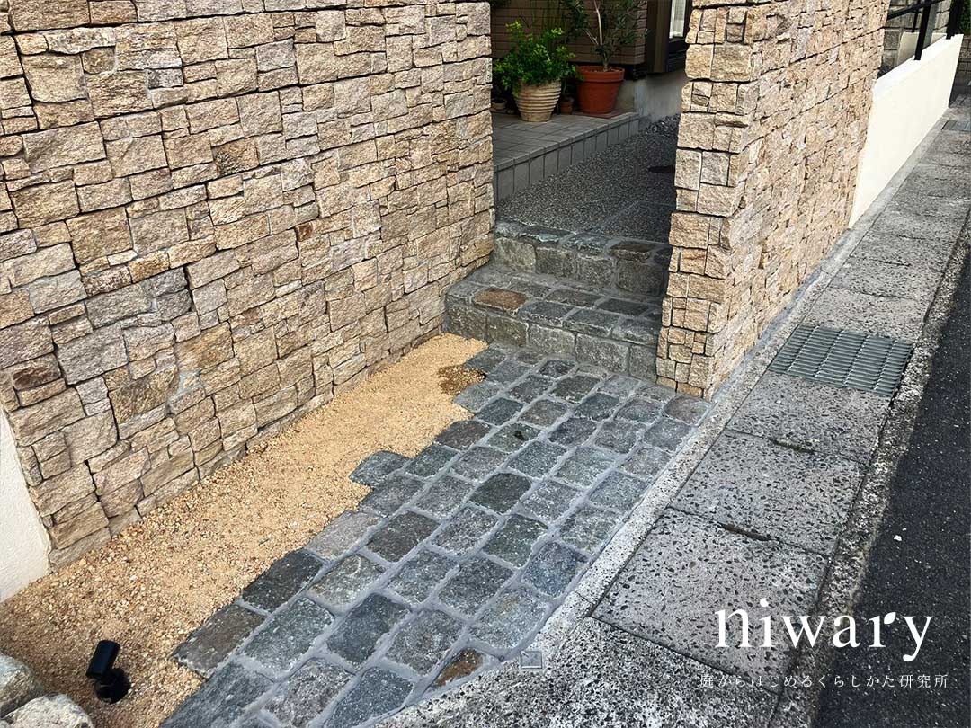 玄関へ続くアプローチは石畳風に整えられ、足元が安定して歩きやすく、雨の日でも滑りにくい安心設計です。