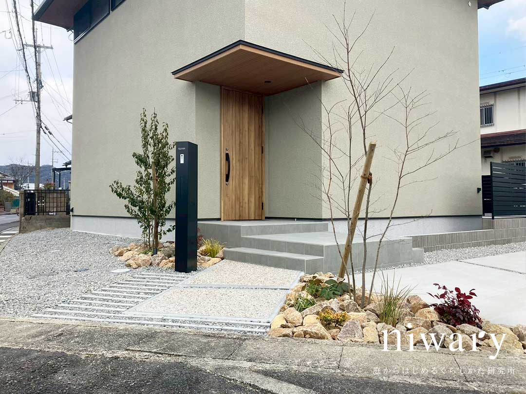 外構全体は色数を抑え、建物の外壁や木調玄関ドアとの調和を意識しました。