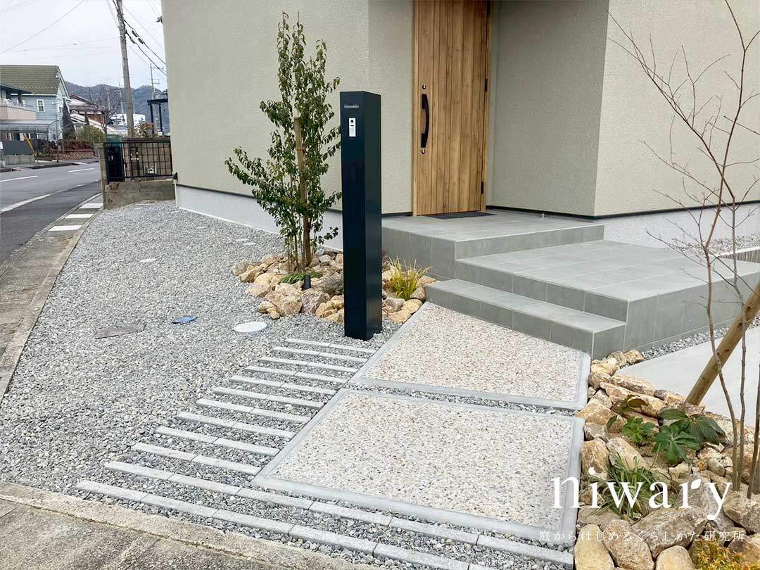 足元にはグリ石や自然石を添え、素材の質感がさりげないアクセントになっています。