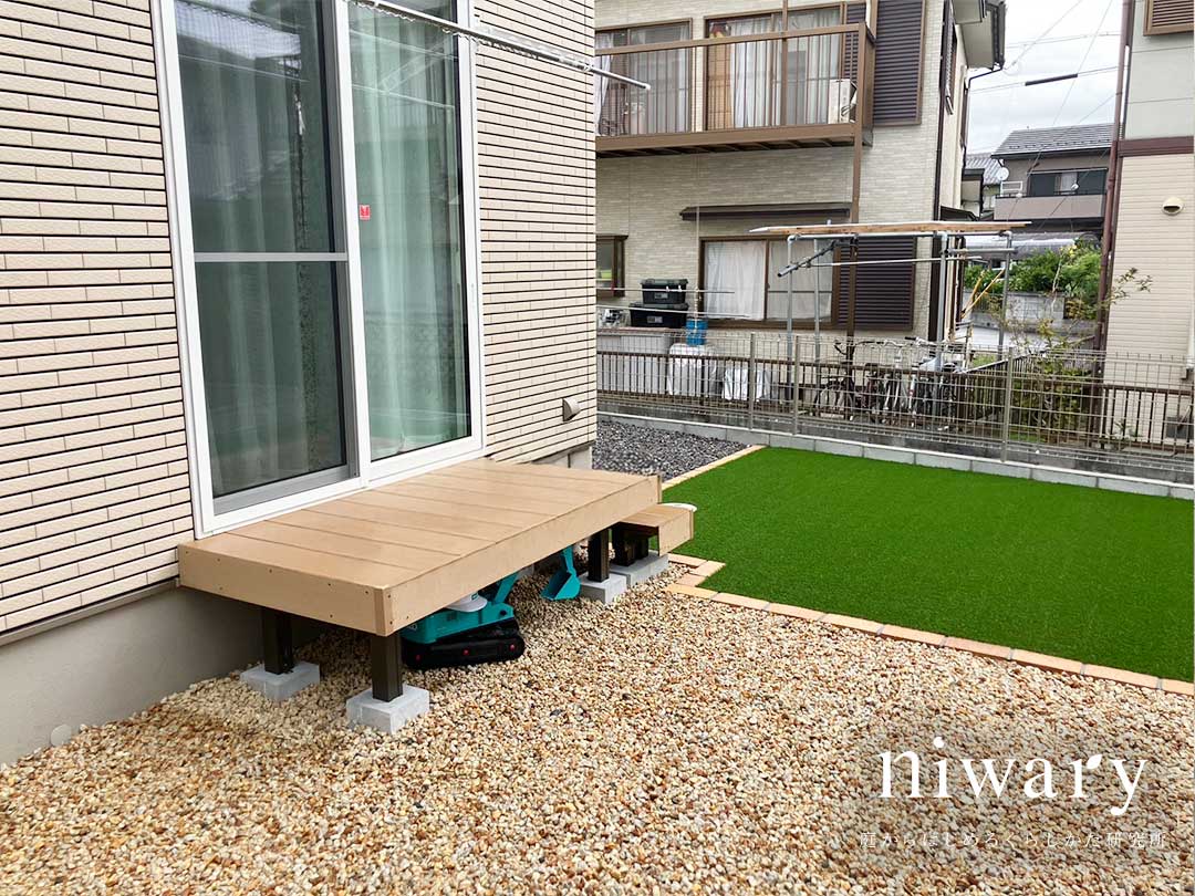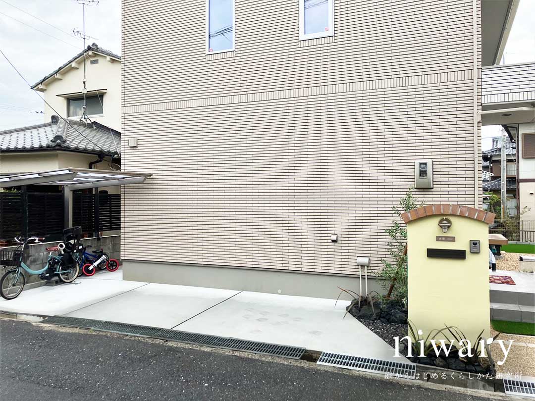 住まいの雰囲気に合わせたやわらかな色合いの門柱や、駐輪スペースをしっかり確保したサイクルポート、人工芝と小さなデッキを組み合わせた庭スペースなど、日常を快適に過ごせる工夫を取り入れています。