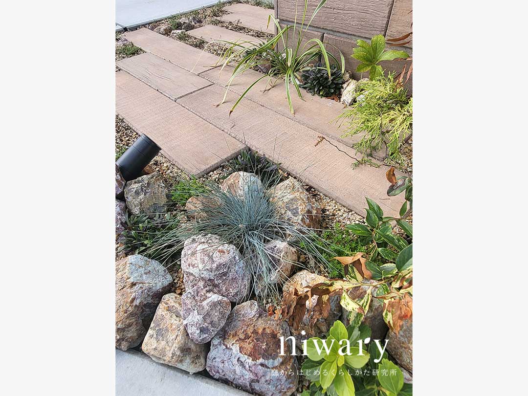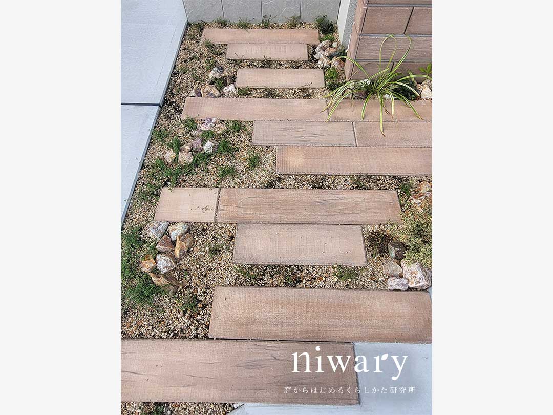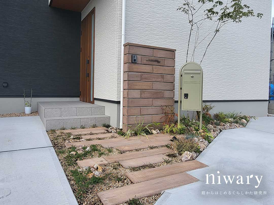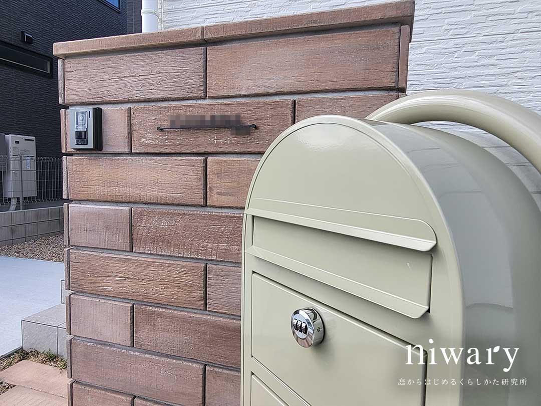 まず目を惹くのは、存在感のある門柱。 リアルな古木の質感を追求したヴィンテージな味わいの木目調ブロックを使用しています。 足元にも擬木枕木を用いて、ナチュラルな雰囲気に・・・ 植栽があることで、さらに門柱を見栄え良く見せてくれます。 薄いカーキ色の丸いフォルムのポストを合わせ、大人かわいいエントランスに仕上がりました。
