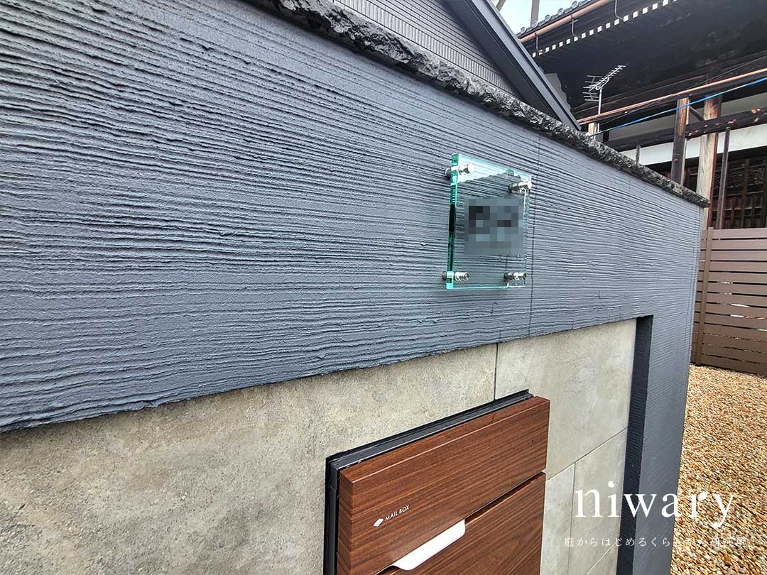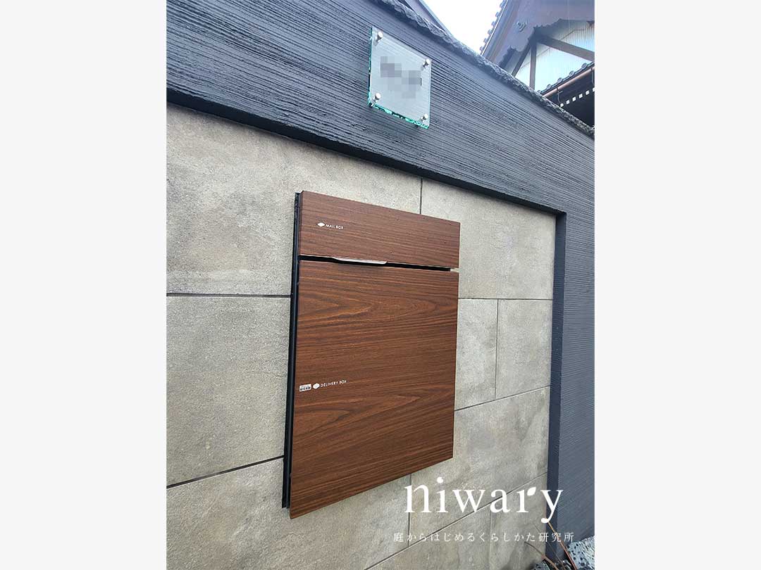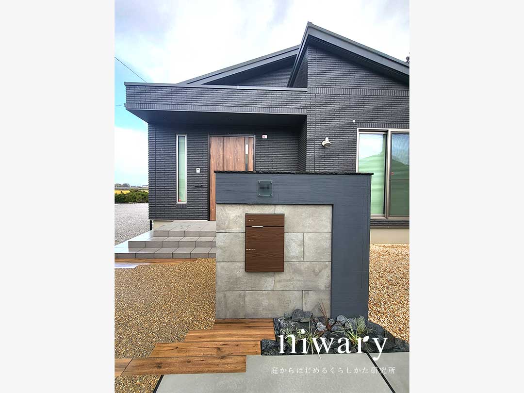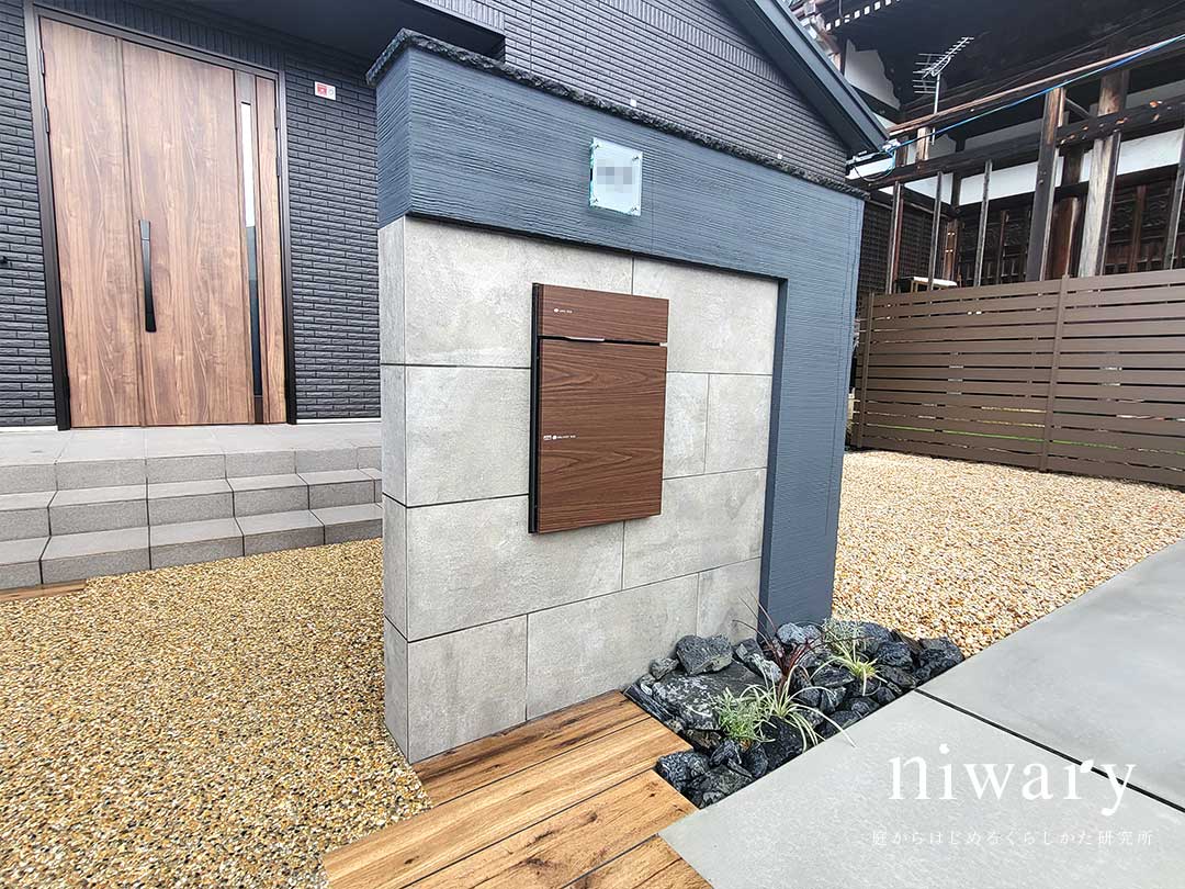タイルの高級感と塗り壁の温かみを持ついいとこどりの門柱に、木目調の宅配ポストをコーディネート。 アプローチにも木目調のタイルを配し、門柱の足元にも植栽をあしらうことで、シックなナチュラルモダン外構にまとまっています。 フェンスも門まわりに合わせて、ナチュラルなブラウン色のものを選びました。
