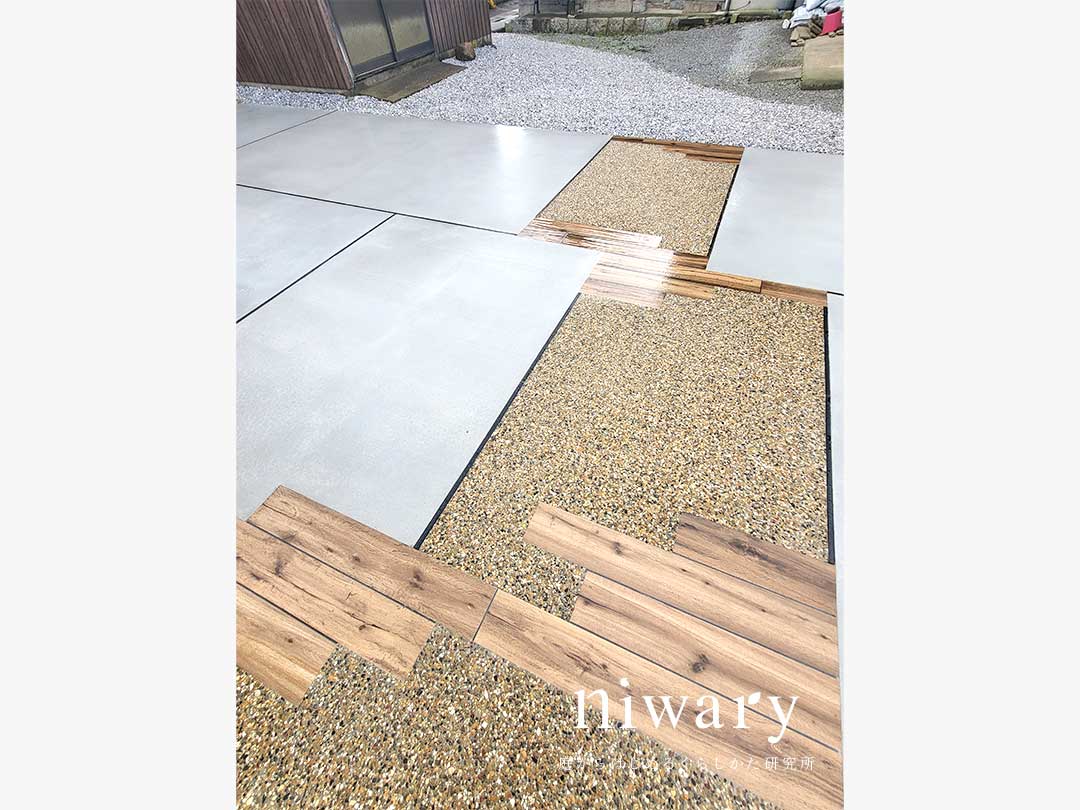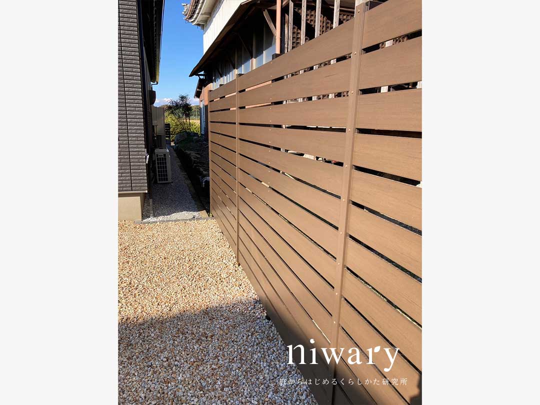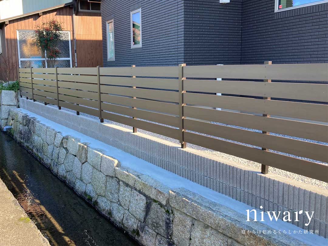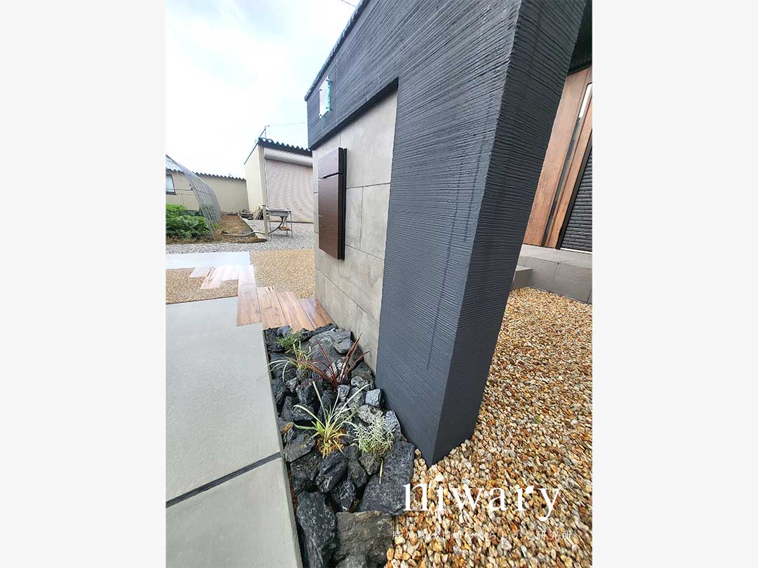 タイルの高級感と塗り壁の温かみを持ついいとこどりの門柱に、木目調の宅配ポストをコーディネート。 アプローチにも木目調のタイルを配し、門柱の足元にも植栽をあしらうことで、シックなナチュラルモダン外構にまとまっています。 フェンスも門まわりに合わせて、ナチュラルなブラウン色のものを選びました。