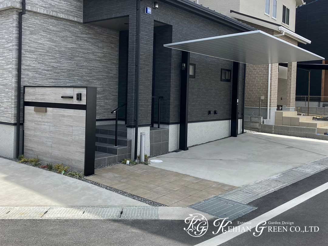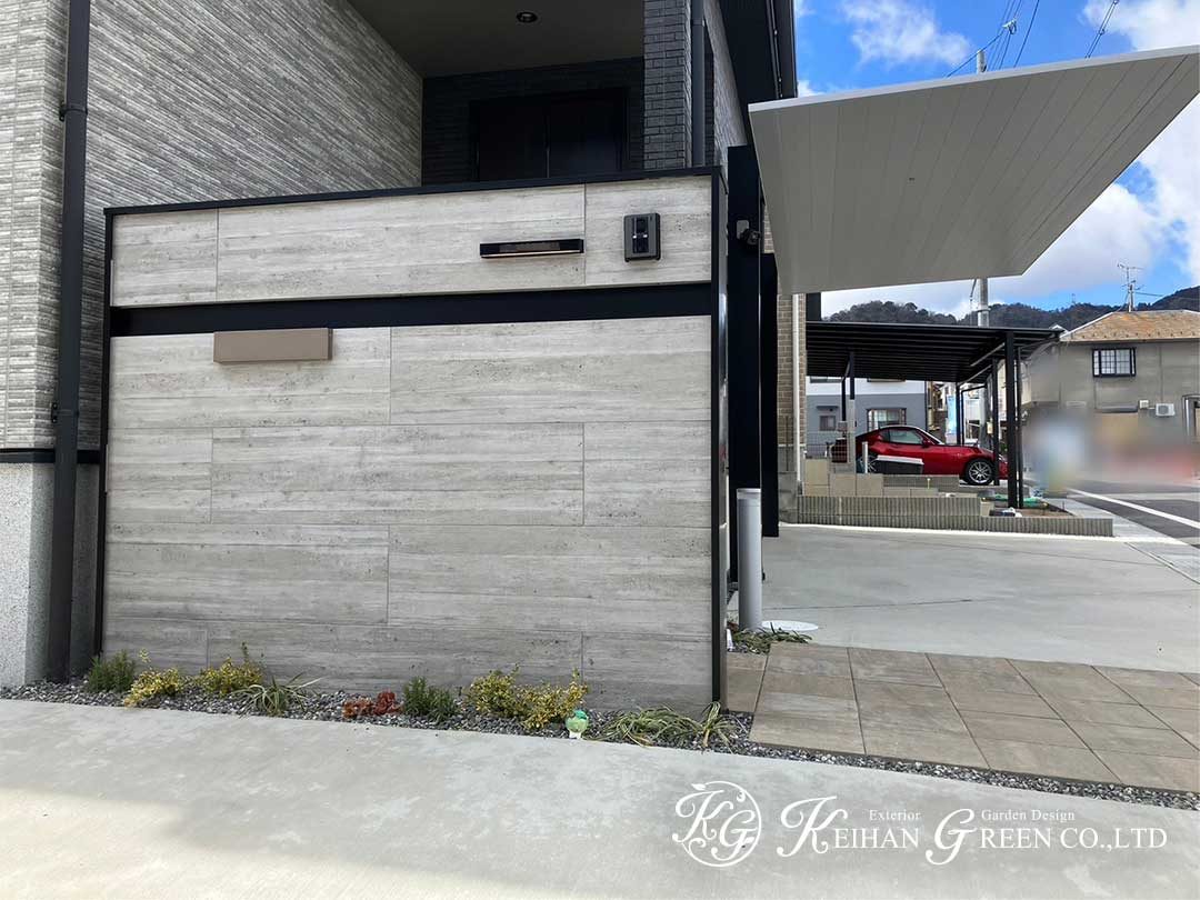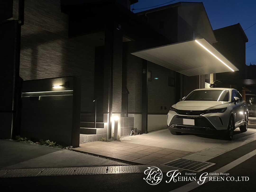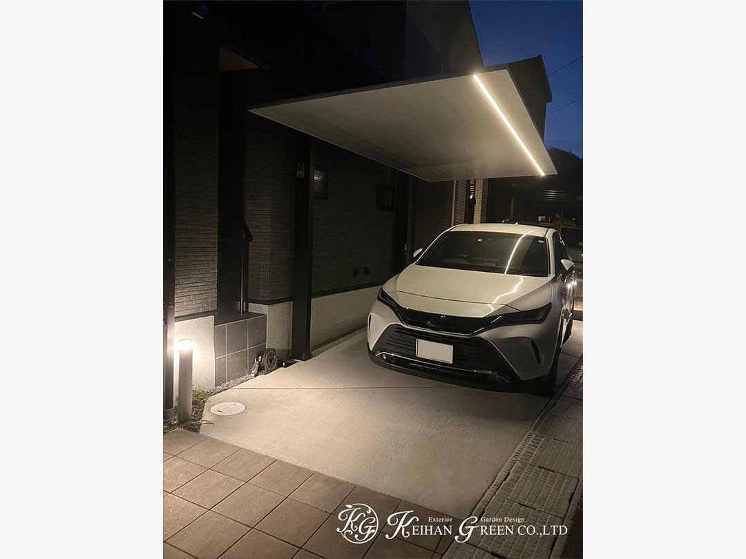 グレイッシュな建物に合わせた、モノトーンデザインのオープン外構です。 存在感のある大き目の門柱には杉板風のタイルを使用。 足元の植栽との相性もよく、モダンな中にも自然を感じるファサードを演出しています。 照明を中に設置することで、夜の雰囲気はより人目を惹きつけるものになっています。 カーポートもモノトーンでまとめ、夜になると、シームレスラインライトでさらにスタイリッシュになります。