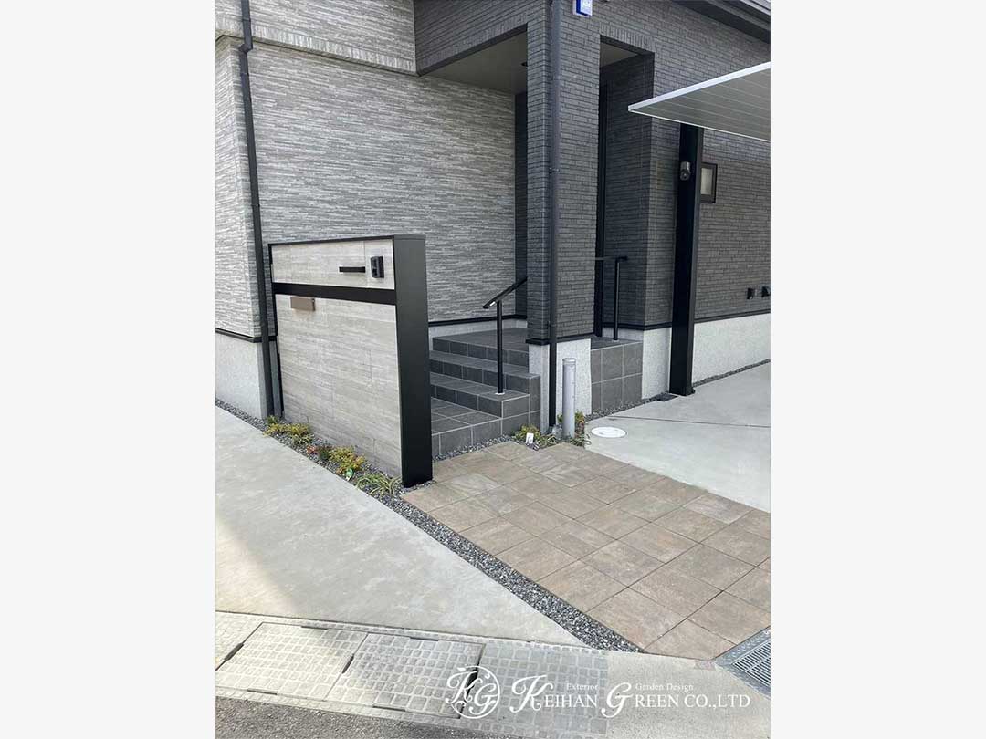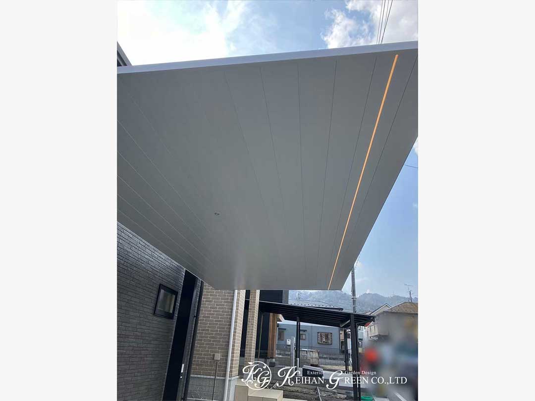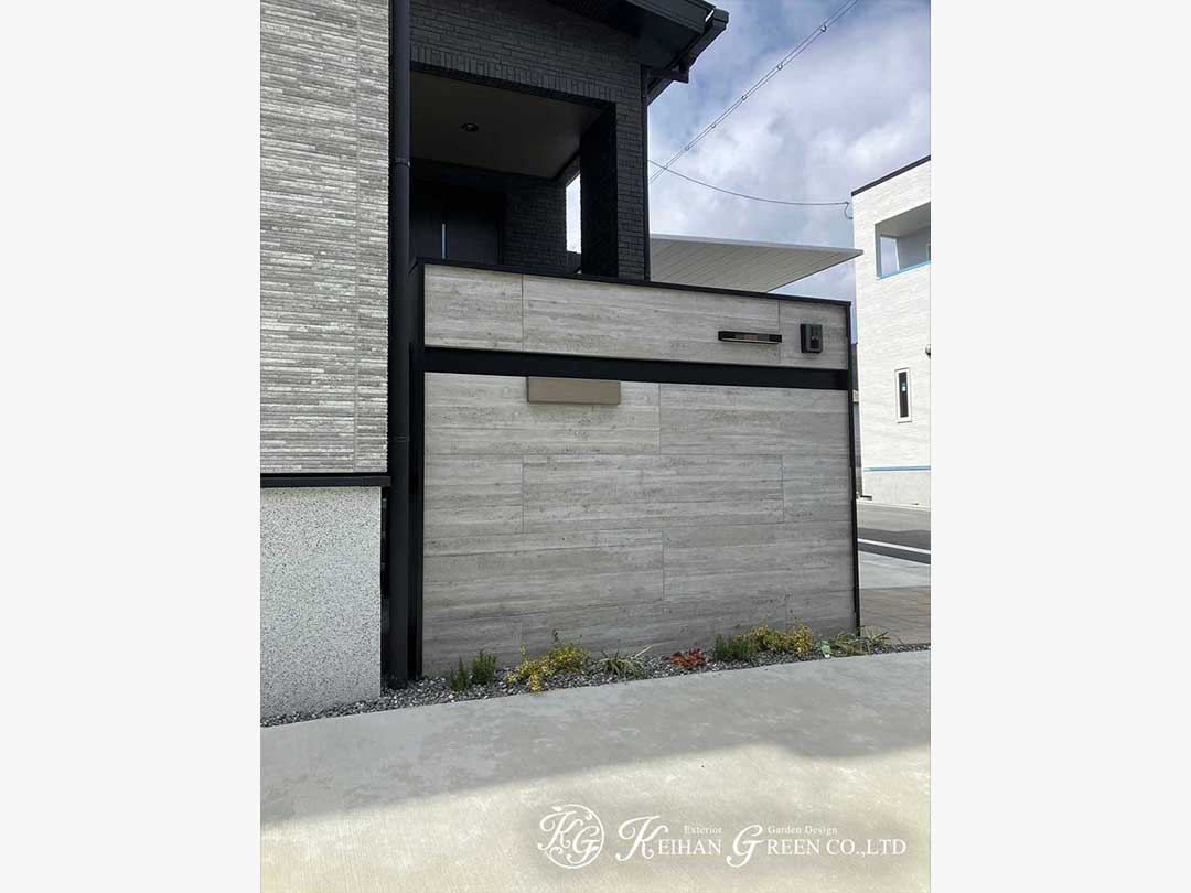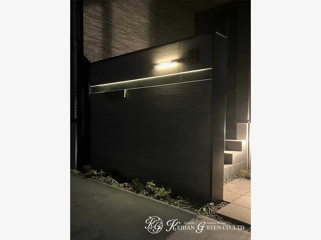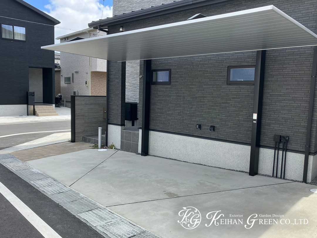 グレイッシュな建物に合わせた、モノトーンデザインのオープン外構です。 存在感のある大き目の門柱には杉板風のタイルを使用。 足元の植栽との相性もよく、モダンな中にも自然を感じるファサードを演出しています。 照明を中に設置することで、夜の雰囲気はより人目を惹きつけるものになっています。 カーポートもモノトーンでまとめ、夜になると、シームレスラインライトでさらにスタイリッシュになります。