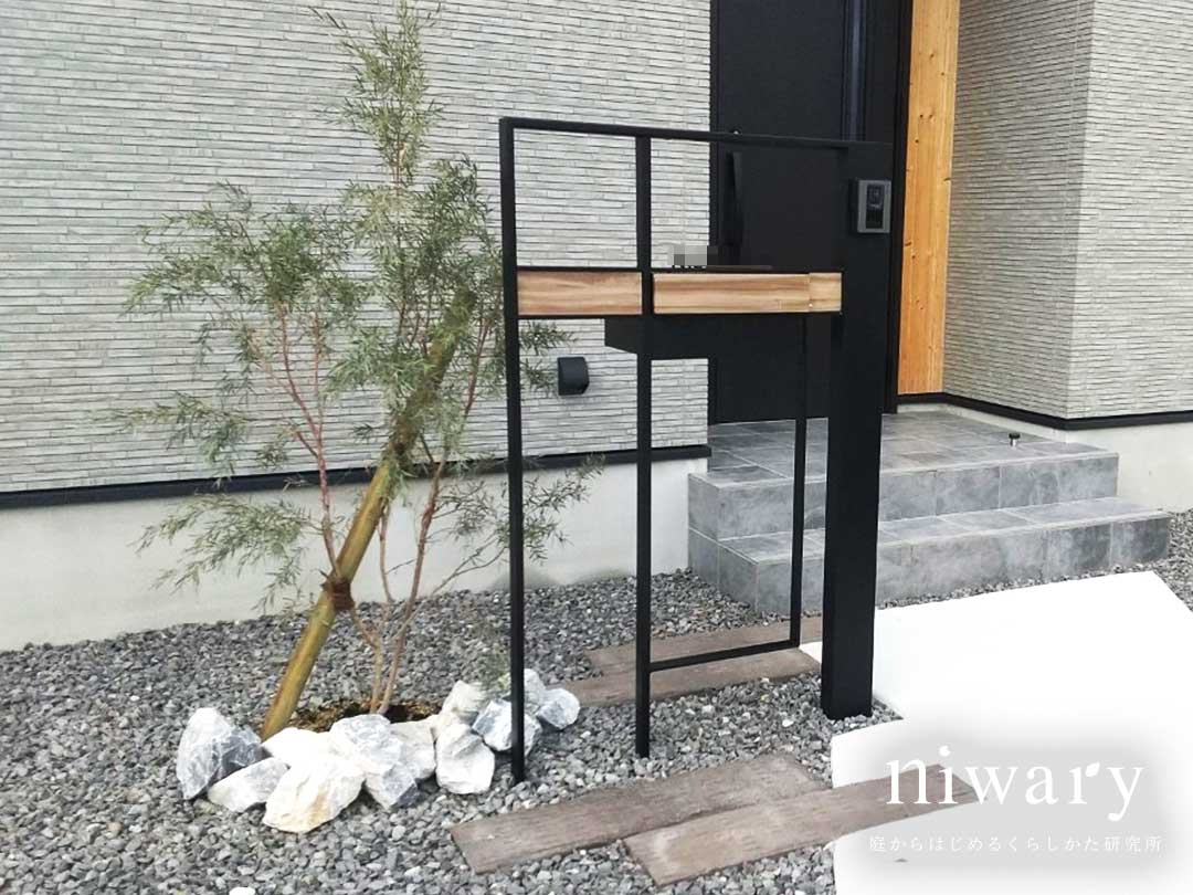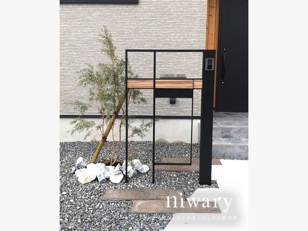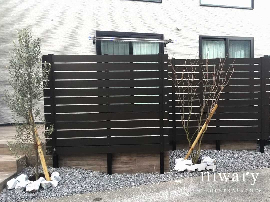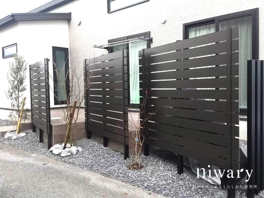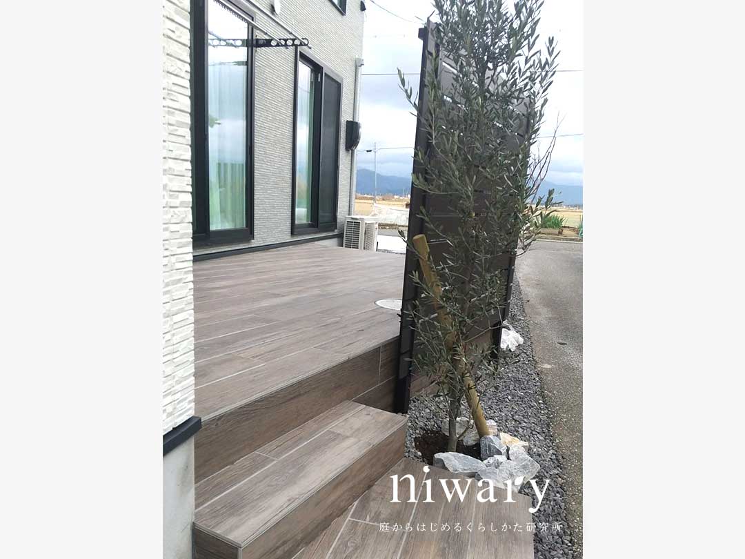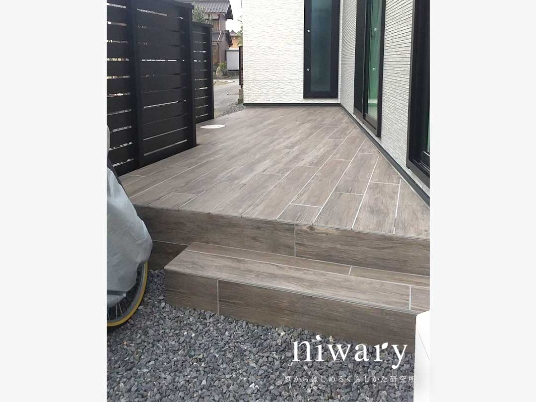 お庭スペースも広さを感じられるように、タイルデッキ・目隠し・植栽をリズミカルに配して、オリジナル感のある空間となっています。