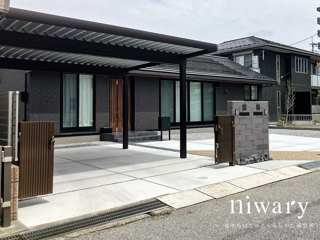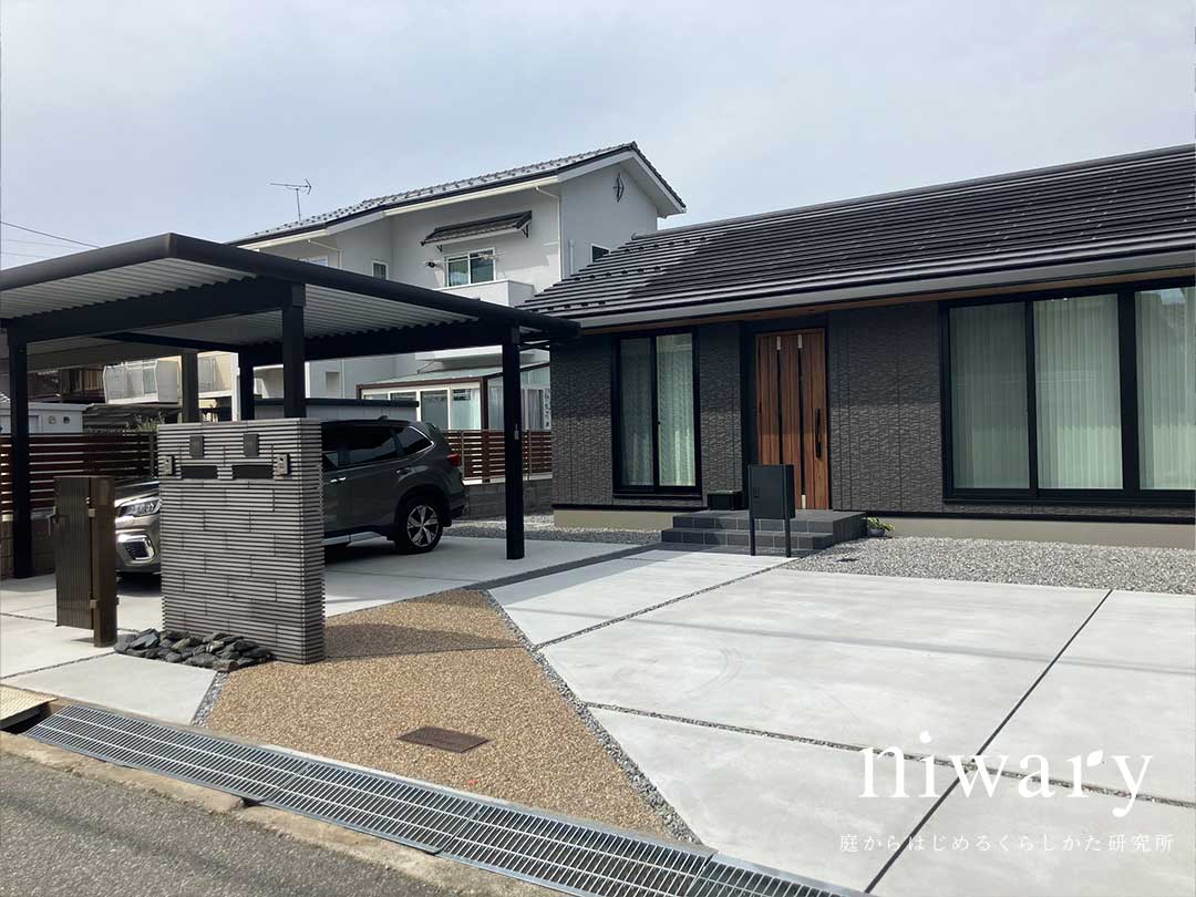 落ち着いた色合いの平屋に合わせて計画された、シンプルで整いのある新築外構。