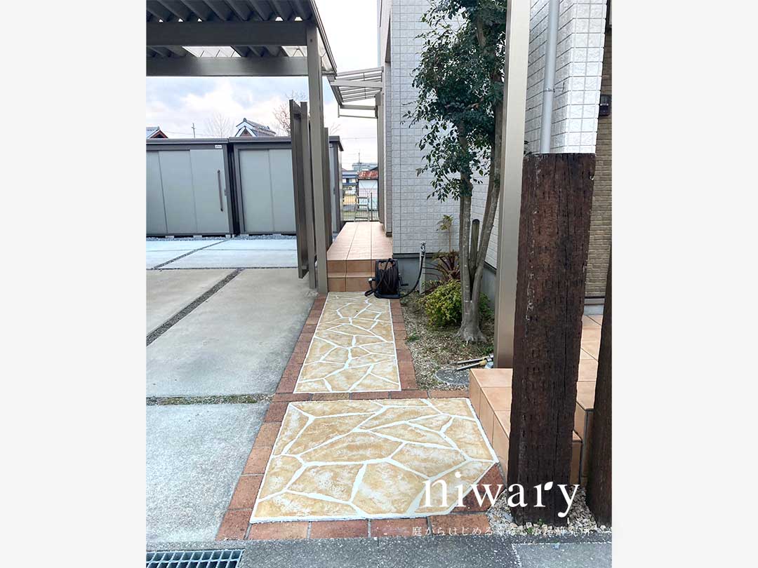 樹脂で固めた洗い出しがはがれてきてしまっていたので、縁のレンガはそのまま残し、キレイに樹脂を取り除き、「ローラーストーン工法」で石張り風のデザインで仕上げました。