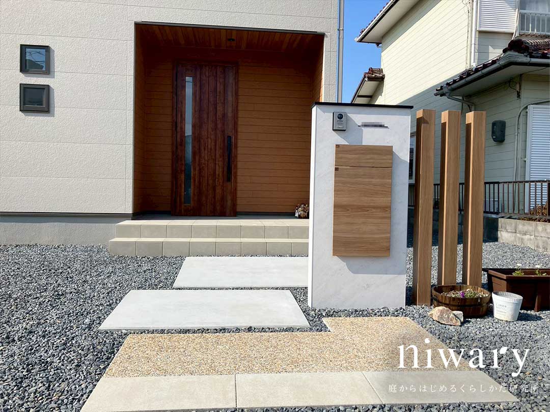 木調カラーを取り入れることで、直線的な外構の中にもやさしい温かみを加え、ナチュラルな雰囲気を演出しています。
