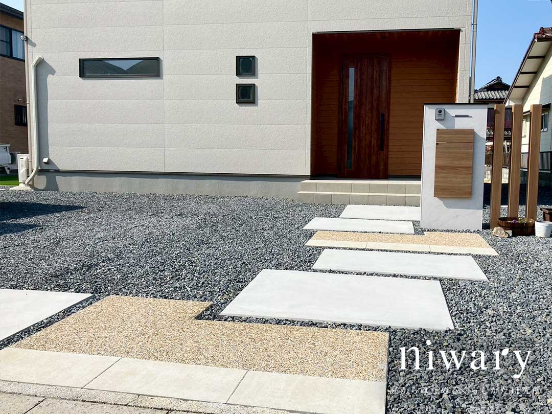 フラットで歩きやすい平板に、砂利の表情がやさしく現れる洗い出しを加えることで、シンプルな中にもナチュラルな雰囲気を感じられる仕上がりになっています。